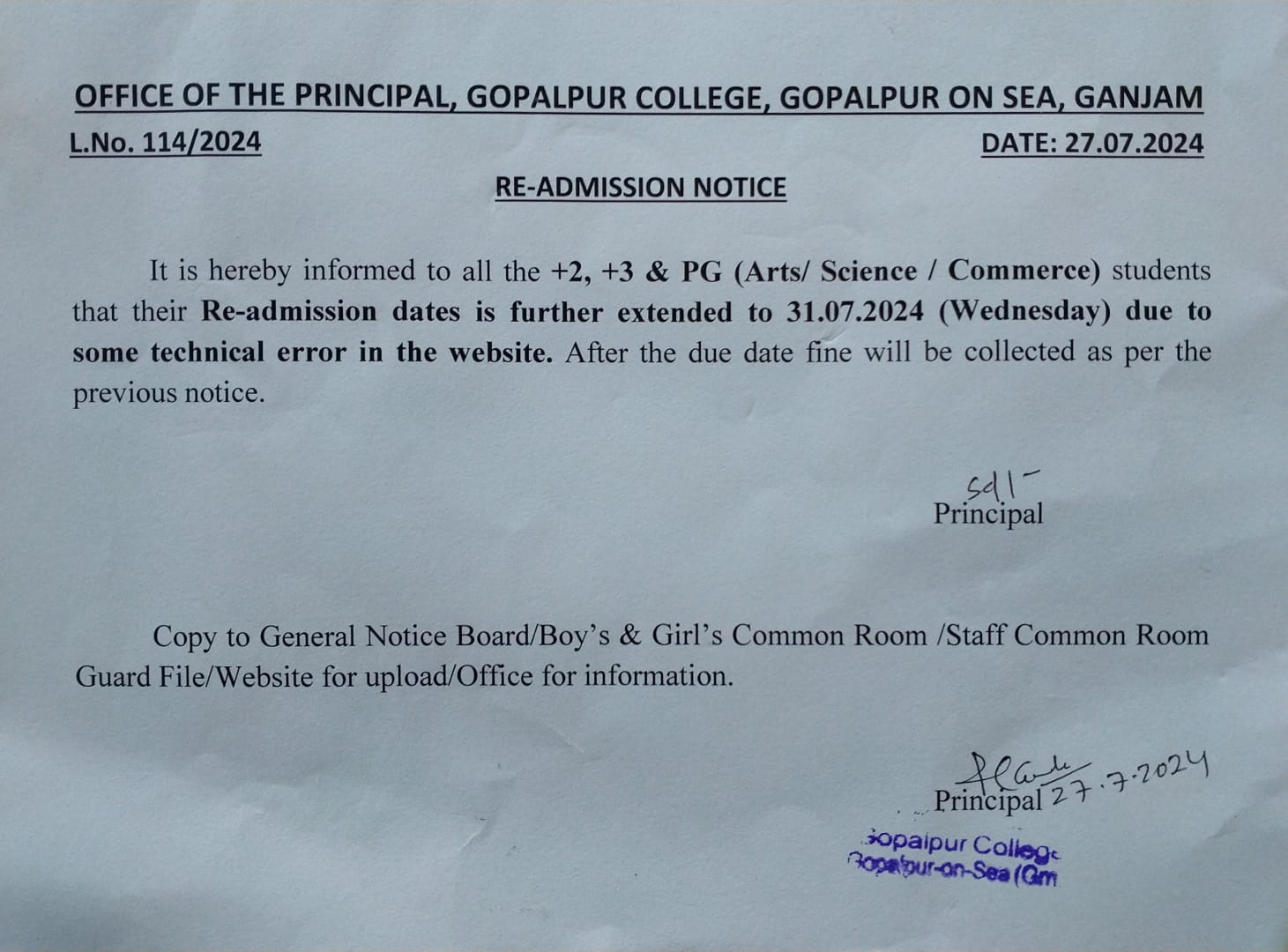 Click HereIt is hereby informed to all the +2, +3 & PG (Arts / Science / Commerce) students that their Re-Admission Dates is further extended to 31 Jul 2024(Wednesdy) due to technical error in the website. After the due date fine will be collect as per previous notice.